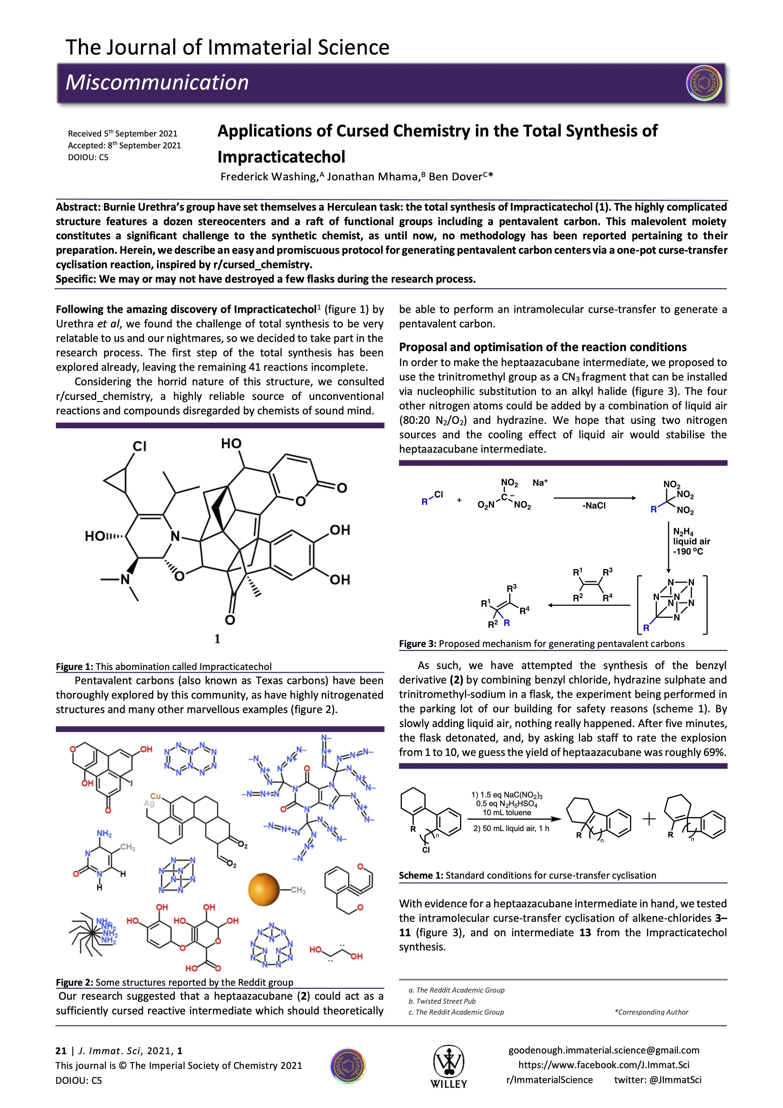 Abstract: Burnie Urethra’s group have set themselves a Herculean task: the total synthesis of Impracticatechol (1). The highly complicated structure features a dozen stereocenters and a raft of functional groups including a pentavalent carbon. This malevolent moiety constitutes a significant challenge to the synthetic chemist, as until now, no methodology has been reported pertaining to their preparation. Herein, we describe an easy and promiscuous protocol for generating pentavalent carbon centers via a one-pot curse-transfer cyclisation reaction, inspired by r/cursed_chemistry.