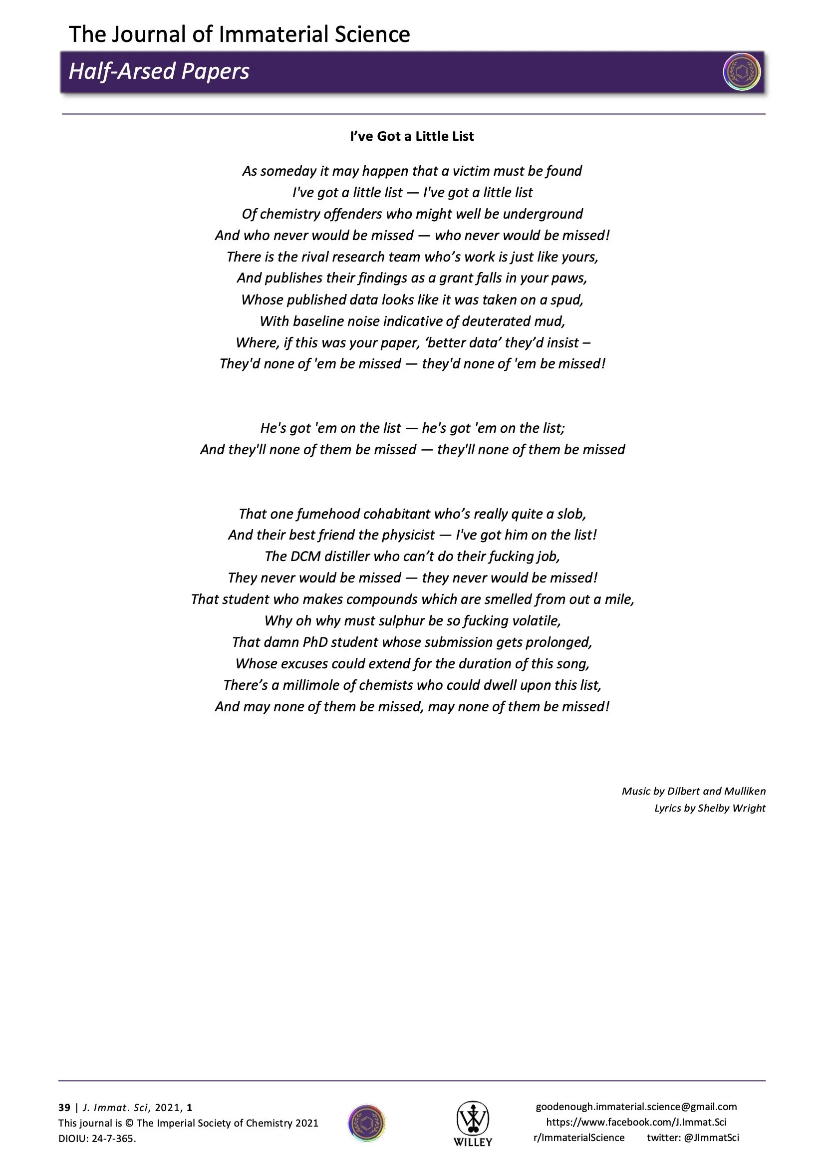 I’ve Got a Little List Chemistry 31 Aug Written By Günther Schlonk Download PDF Abstract: A song about laboratory grievences, in tribute to Gilbert and Sullivan. Cover Song Günther Schlonk