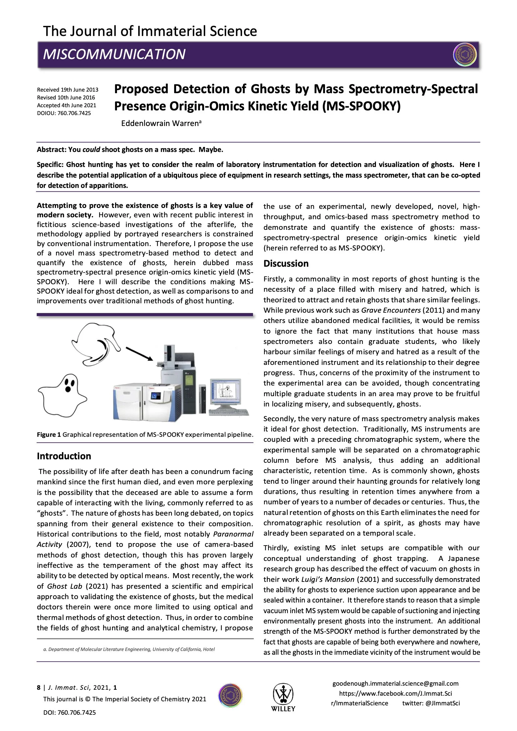 Abstract: Ghost hunting has yet to consider the realm of laboratory instrumentation for detection and visualization of ghosts. Here I describe the potential application of a ubiquitous piece of equipment in research settings, the mass spectrometer, that can be co-opted for detection of apparitions.