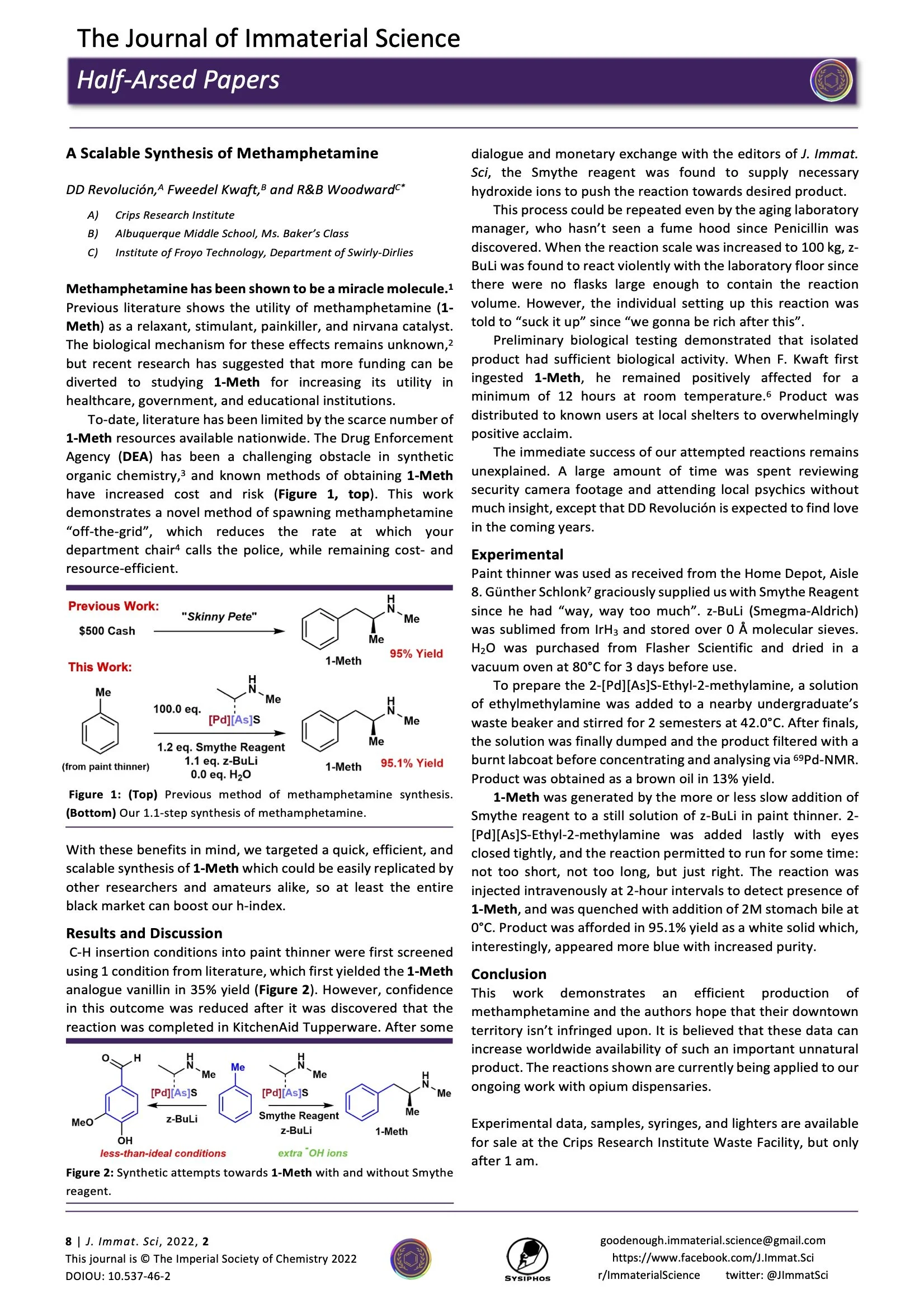 Methamphetamine has been shown to be a miracle molecule. Previous literature shows the utility of methamphetamine as a relaxant, stimulant, painkiller, and nirvana catalyst. The biological mechanism for these effects remains unknown, but recent research has suggested that more funding can be diverted to studying meth for increasing its utility in healthcare, government, and educational institutions.