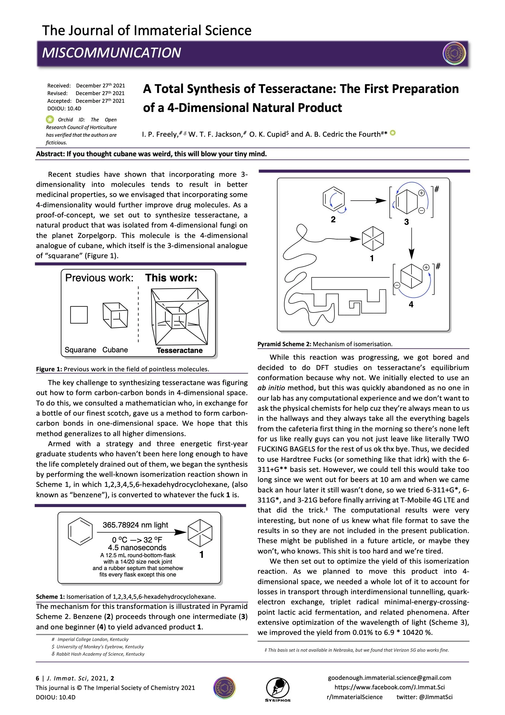 There follows a frivolous frolic through some very serious issues. The authors clearly lack an understanding of the topic, or a sense of decency and taste more generally. I find this unsuitable for publication in Nature, and suggest J. Immat. Sci. - Reviewer 2