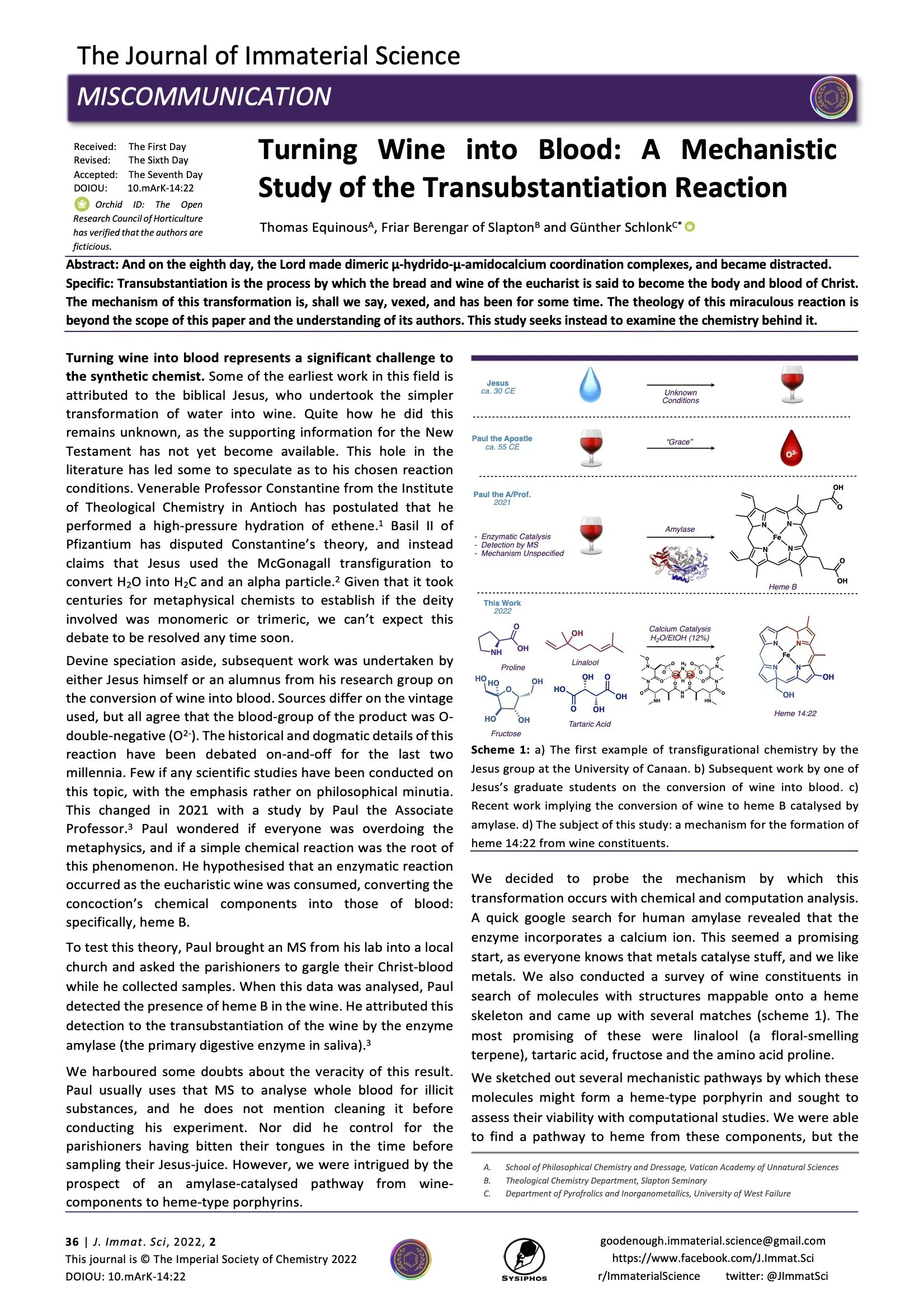 Transubstantiation is the process by which the bread and wine of the eucharist is said to become the body and blood of Christ. The mechanism of this transformation is, shall we say, vexed, and has been for some time. The theology of this miraculous reaction is beyond the scope of this paper and the understanding of its authors. This study seeks instead to examine the chemistry behind it.