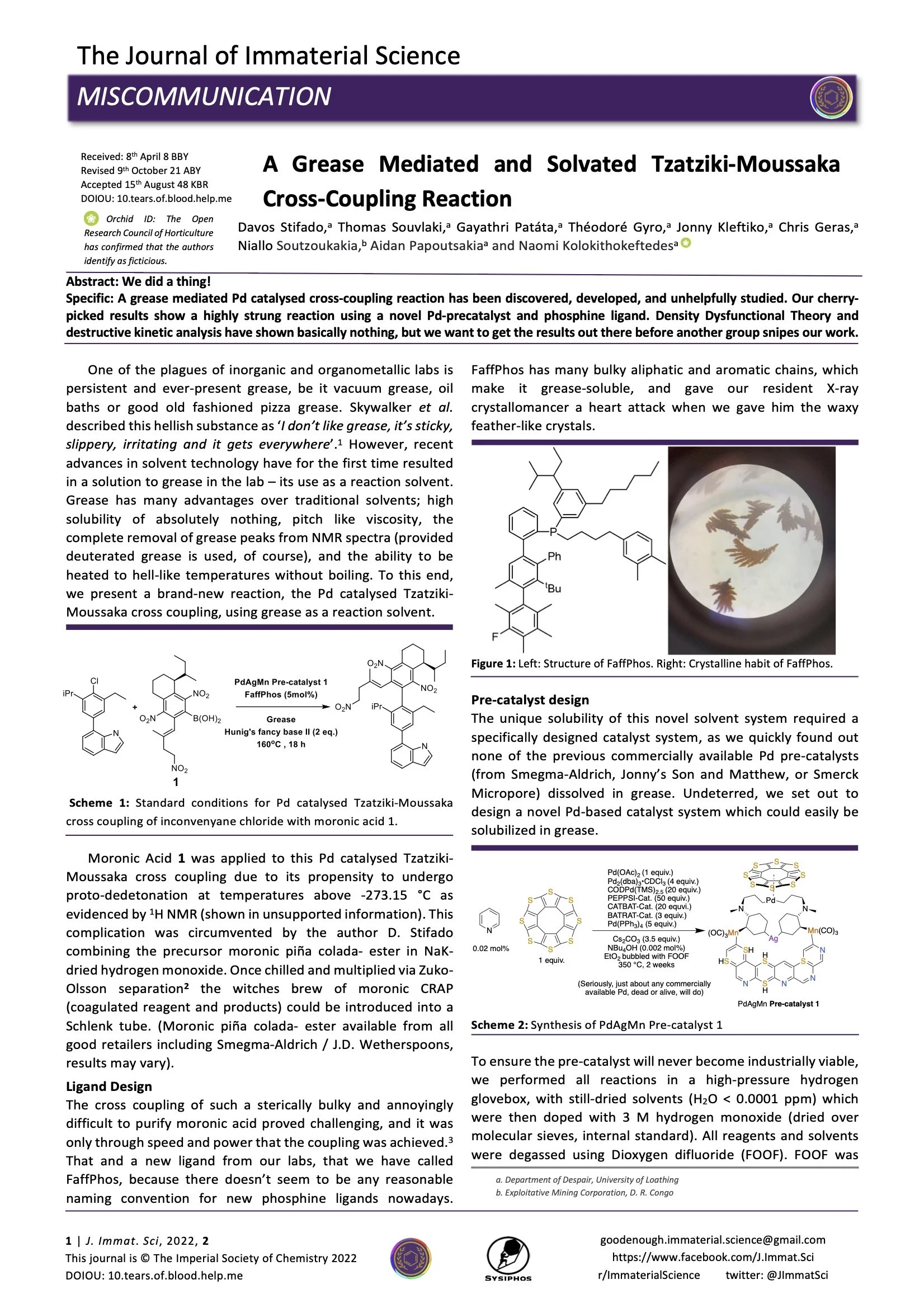 A grease mediated Pd catalysed cross-coupling reaction has been discovered, developed, and unhelpfully studied. Our cherry-picked results show a highly strung reaction using a novel Pd-precatalyst and phosphine ligand. Density Dysfunctional Theory and destructive kinetic analysis have shown basically nothing, but we want to get the results out there before another group snipes our work.