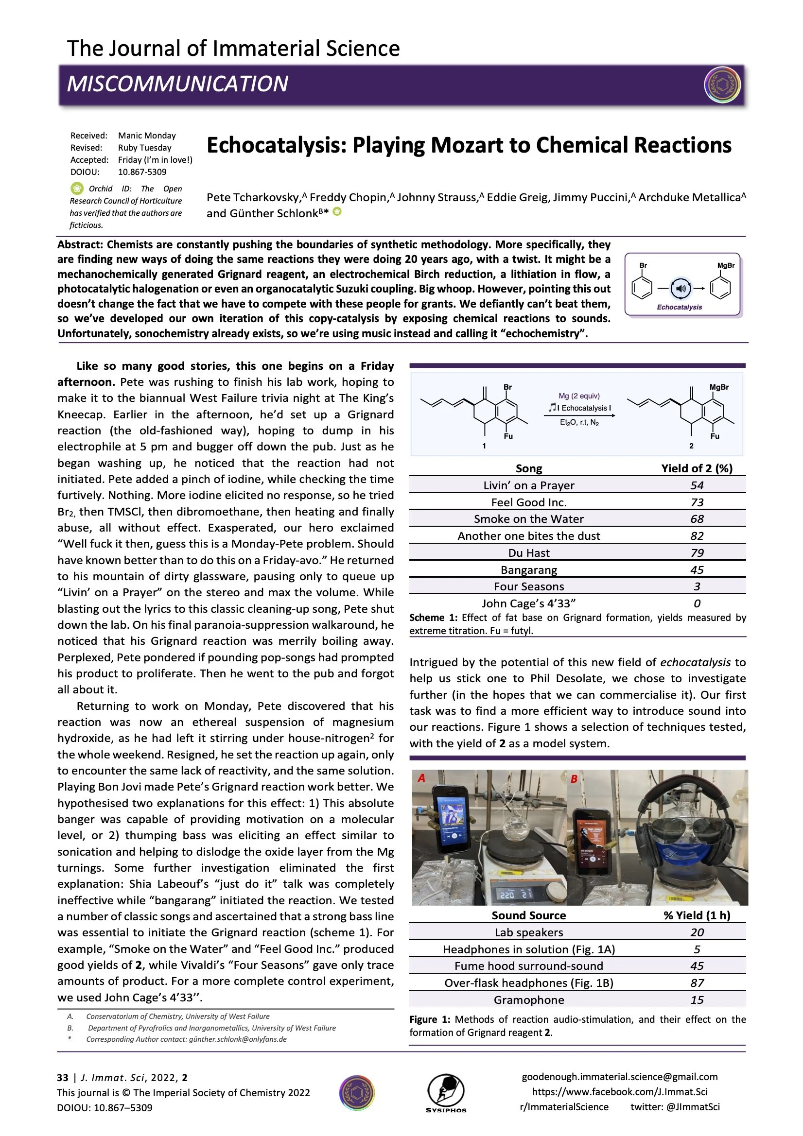 Abstract: Chemists are constantly pushing the boundaries of synthetic methodology. More specifically, they are finding new ways of doing the same reactions they were doing 20 years ago, with a twist. We’ve developed our own iteration of this copy-catalysis by exposing chemical reactions to sounds. Unfortunately, sonochemistry already exists, so we’re using music instead and calling it “echochemistry”.