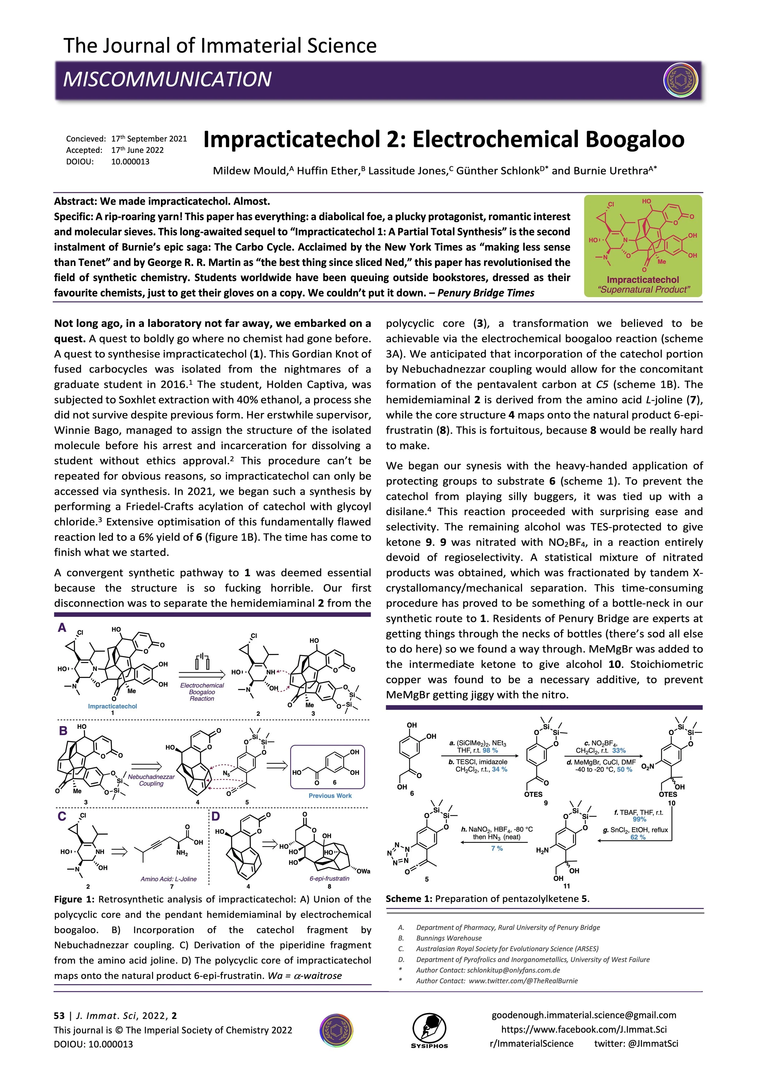 Abstract: A rip-roaring yarn! This paper has everything: a diabolical foe, a plucky protagonist, romantic interest and molecular sieves. This long-awaited sequel to “Impracticatechol 1: A Partial Total Synthesis” is the second instalment of Burnie’s epic saga: The Carbo Cycle.