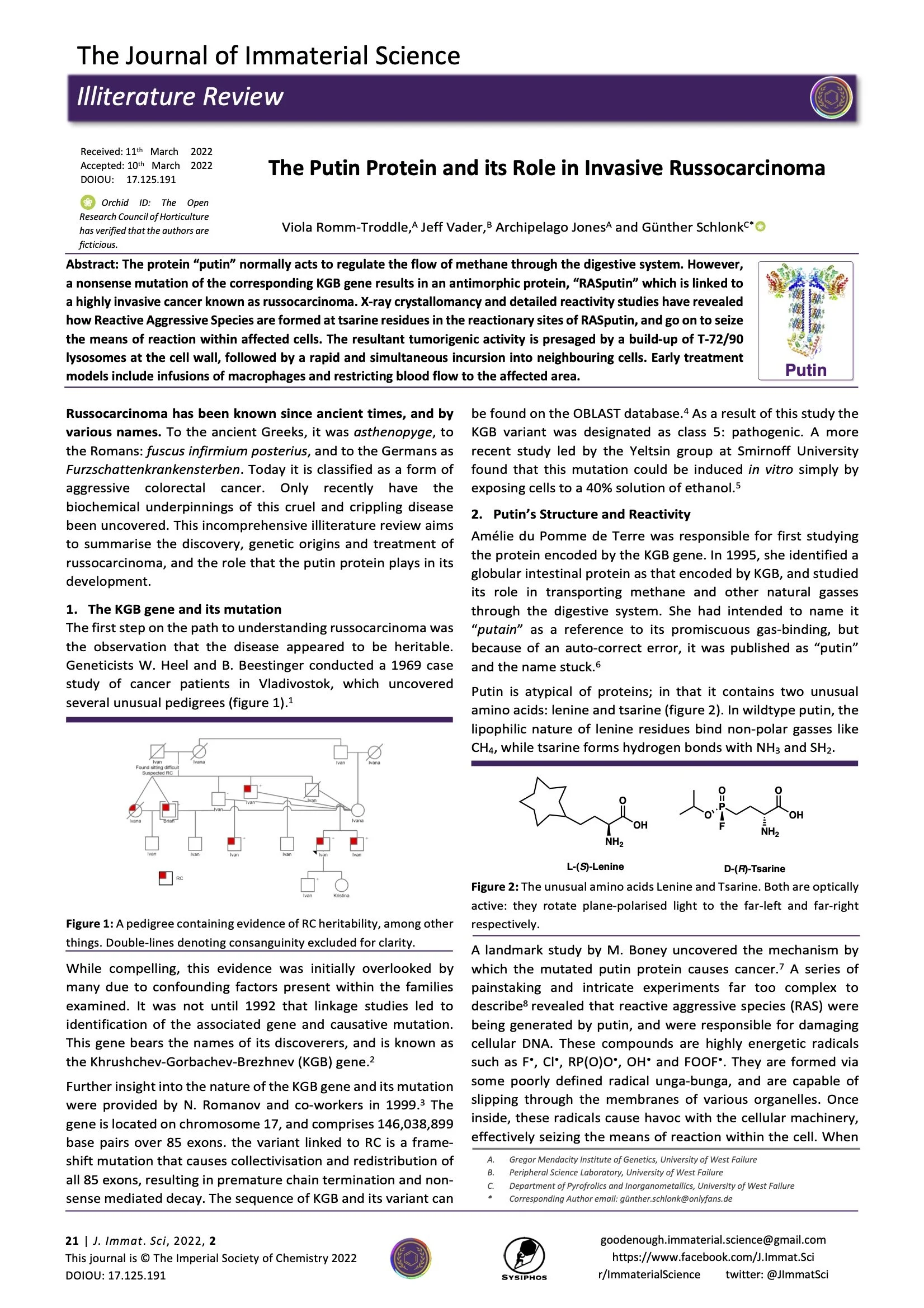 Abstract: The protein “putin” normally acts to regulate the flow of methane through the digestive system. However, a nonsense mutation of the corresponding KGB gene results in an antimorphic protein, “RASputin” which is linked to a highly invasive cancer known as russocarcinoma. X-ray crystallomancy and detailed reactivity studies have revealed how Reactive Aggressive Species are formed at tsarine residues in the reactionary sites of RASputin, and go on to seize the means of reaction within affected cells. The resultant tumorigenic activity is presaged by a build-up of T-72/90 lysosomes at the cell wall, followed by a rapid and simultaneous incursion into neighbouring cells. Early treatment models include infusions of macrophages and restricting blood flow to the affected area.