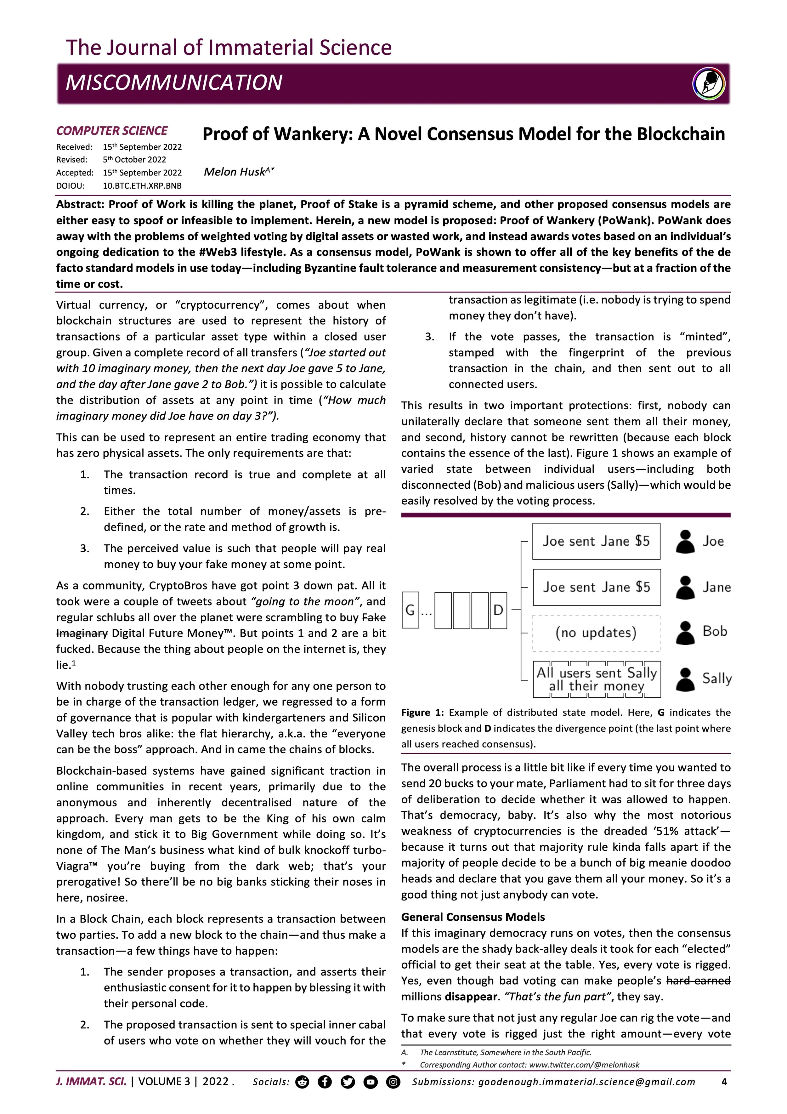 Proof of Work is killing the planet, Proof of Stake is a pyramid scheme, and other proposed consensus models are either easy to spoof or infeasible to implement. Herein, a new model is proposed: Proof of Wankery (PoWank). PoWank does away with the problems of weighted voting by digital assets or wasted work, and instead awards votes based on an individual’s ongoing dedication to the #Web3 lifestyle.
