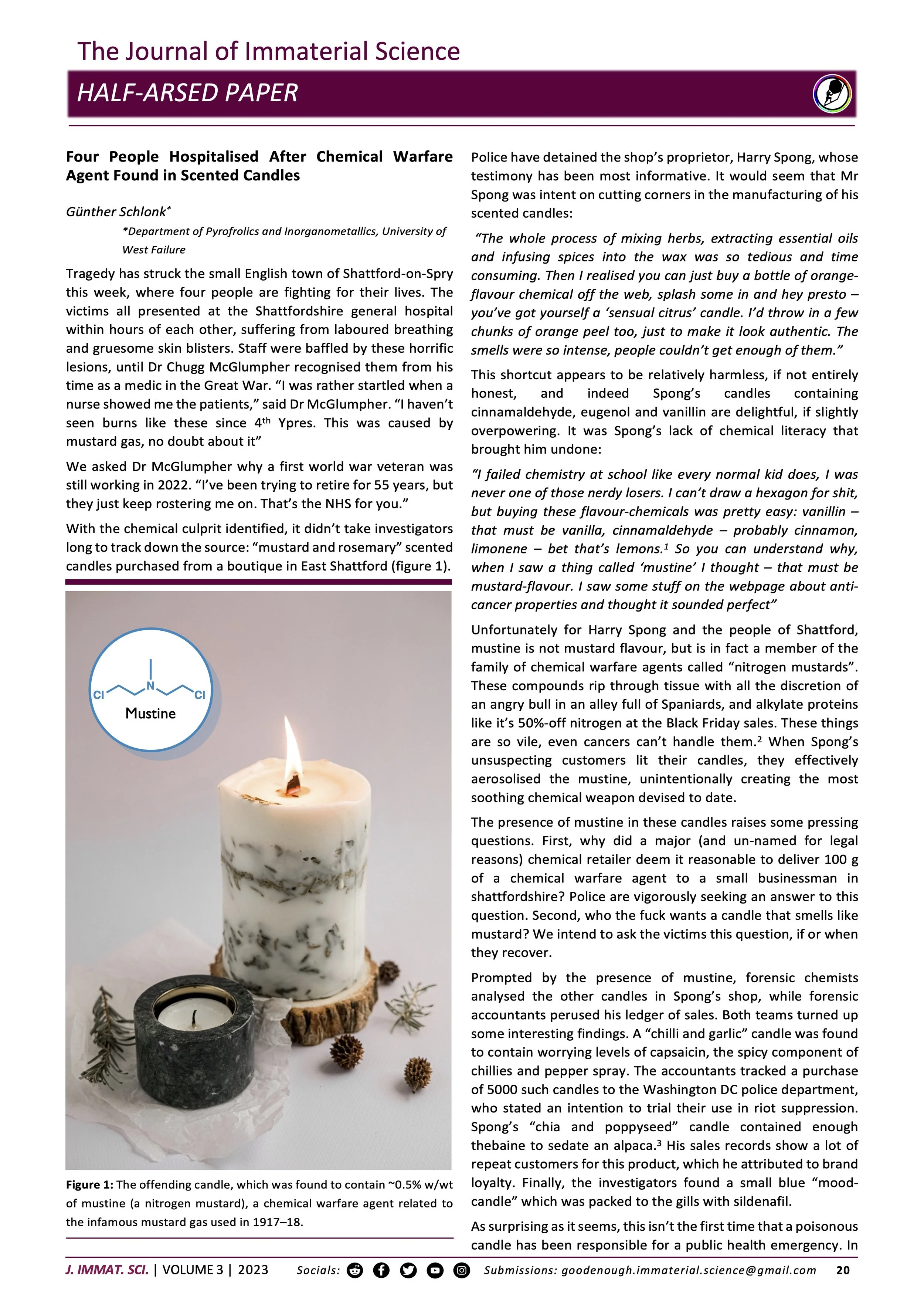 Four People Hospitalised After Chemical Warfare Agent Found in Scented Candles News 29 Aug Written By Günther Schlonk Download PDF Abstract: This article describes one of the least relaxing baths of all history. Schlonk Günther Schlonk