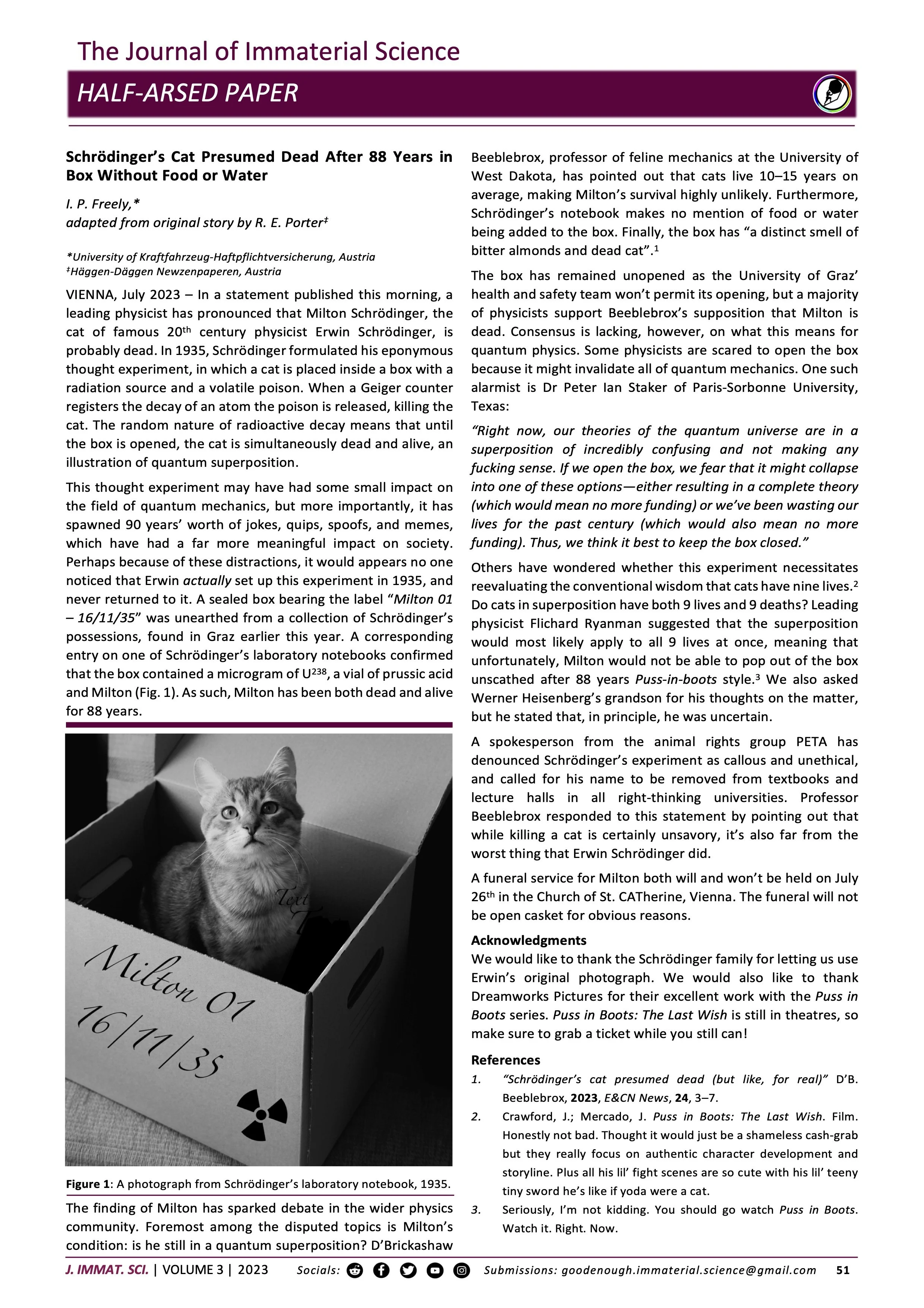 Abstract: In a statement published this morning, a leading physicist has pronounced that Milton Schrödinger, the cat of famous 20th century physicist Erwin Schrödinger, is probably dead.