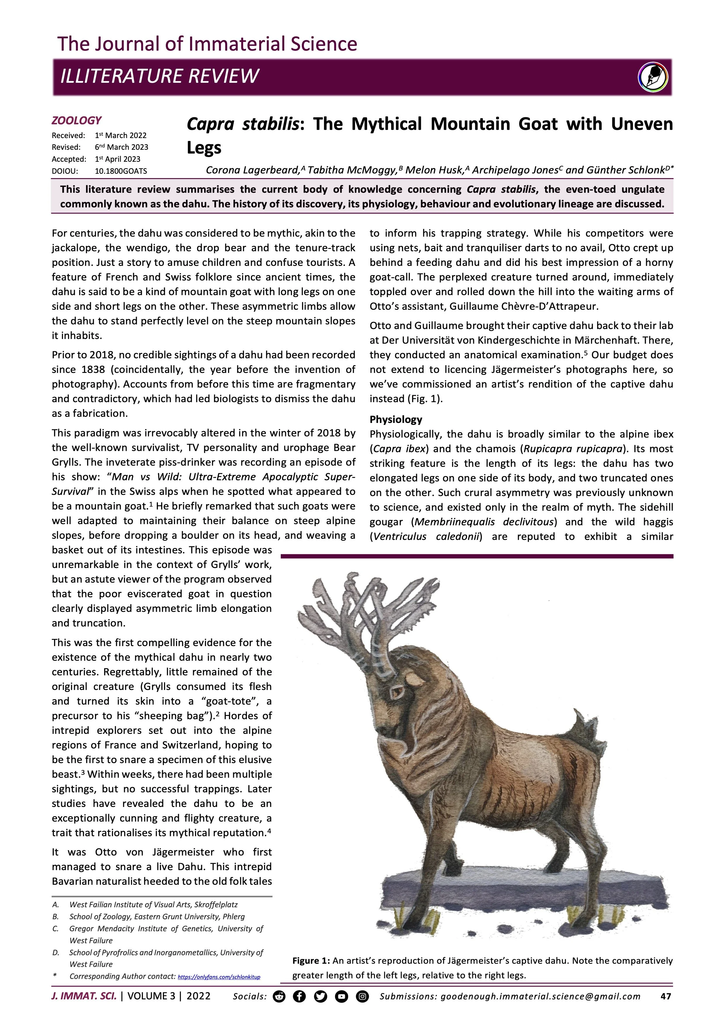 Abstract: This literature review summarises the current body of knowledge concerning Capra stabilis, the even-toed ungulate commonly known as the dahu. The history of its discovery, its physiology, behaviour and evolutionary lineage are discussed.