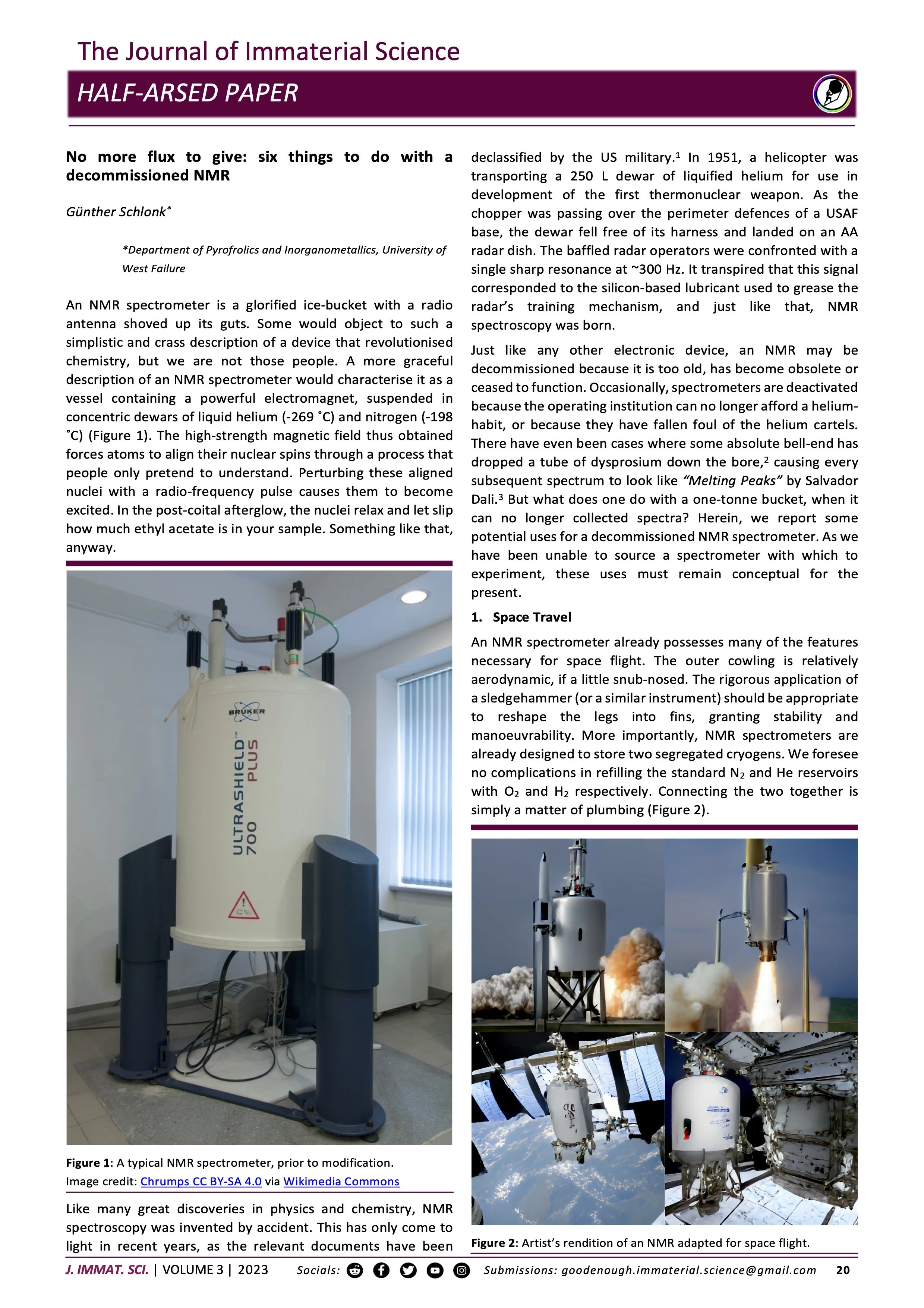 No More Flux to Give: Six Things to do with a Decommissioned NMR Chemistry 29 Aug Written By Günther Schlonk Download PDF Abstract: Reduce reuse recycle. SchlonkSpectroscopy Günther Schlonk
