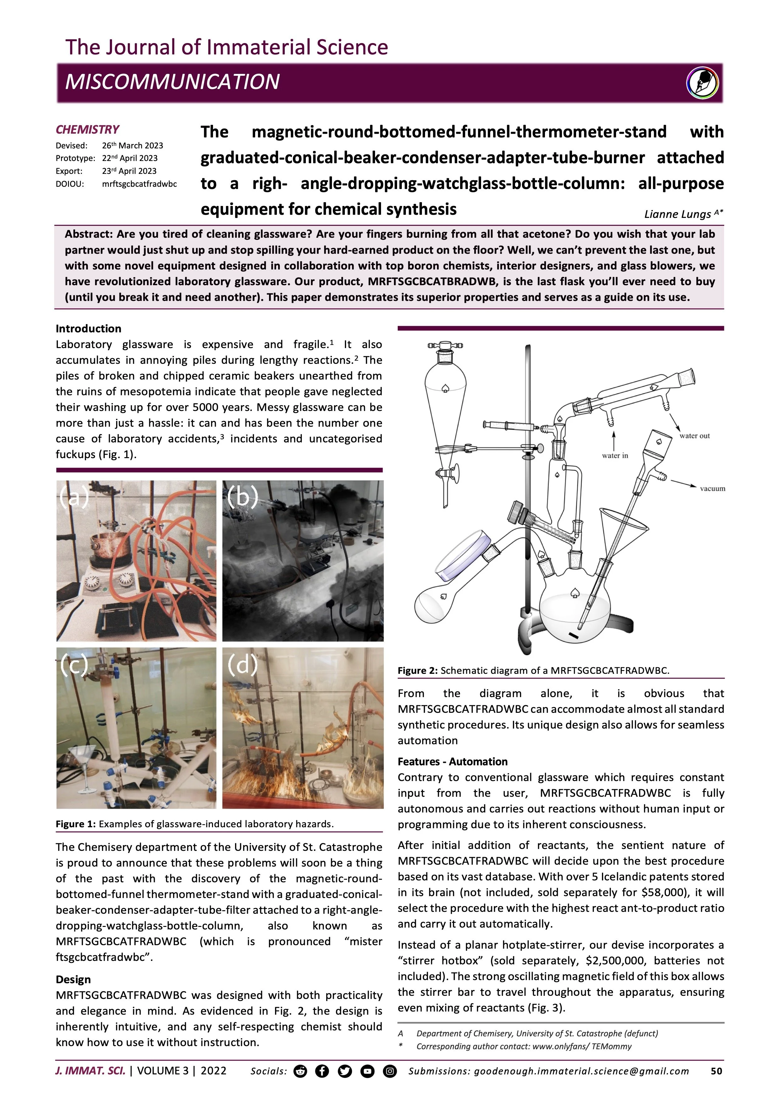 Abstract: Are you tired of cleaning glassware? Are your fingers burning from all that acetone? Do you wish that your lab partner would just shut up and stop spilling your hard-earned product on the floor? Well, we can’t prevent the last one, but with some novel equipment designed in collaboration with top boron chemists, interior designers, and glass blowers, we have revolutionized laboratory glassware. Our product, MRFTSGCBCATBRADWB, is the last flask you’ll ever need to buy (until you break it and need another). This paper demonstrates its superior properties and serves as a guide on its use.