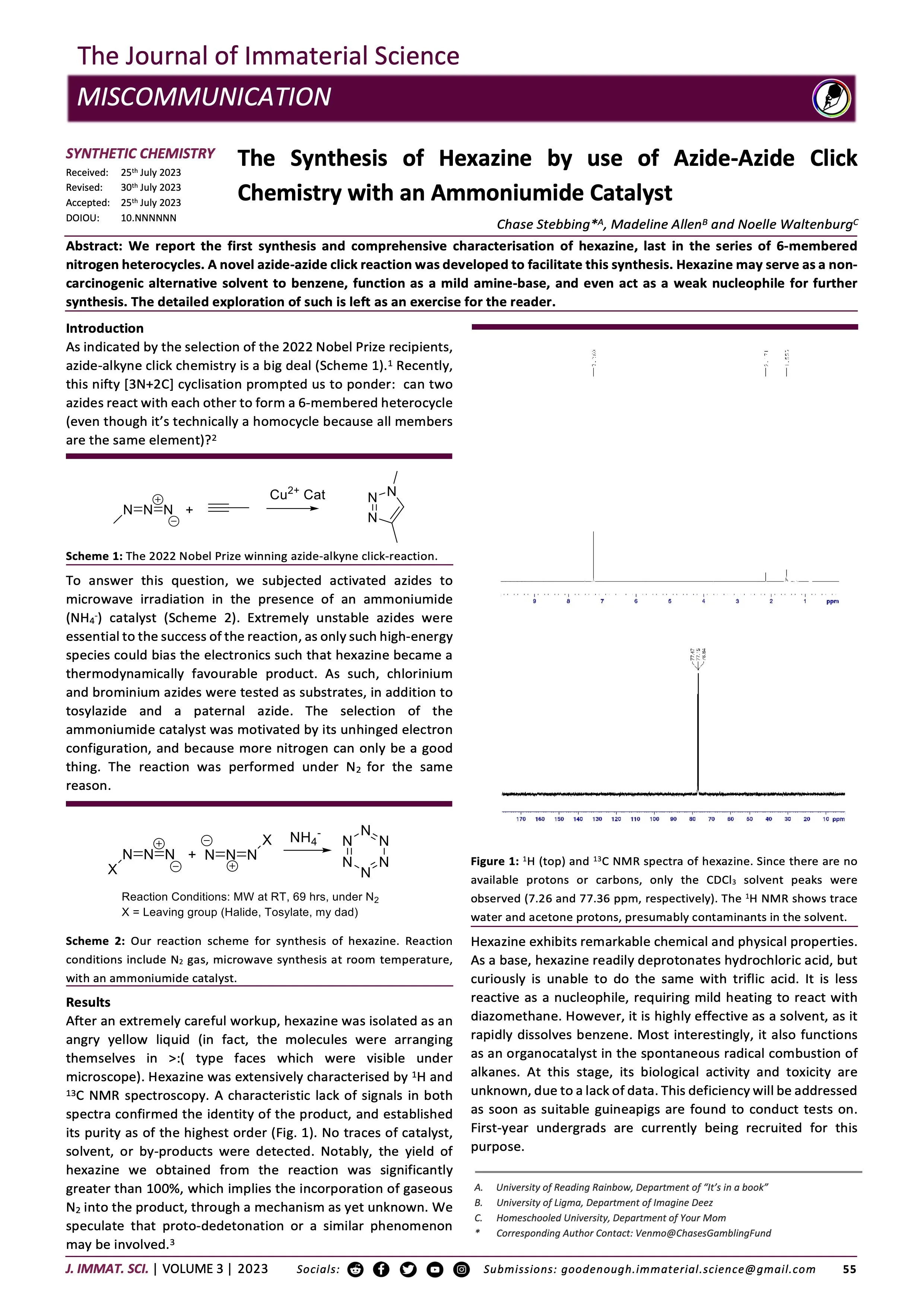 Abstract: We report the first synthesis and comprehensive characterisation of hexazine, last in the series of 6-membered nitrogen heterocycles. A novel azide-azide click reaction was developed to facilitate this synthesis. Hexazine may serve as a non-carcinogenic alternative solvent to benzene, function as a mild amine-base, and even act as a weak nucleophile for further synthesis. The detailed exploration of such is left as an exercise for the reader.