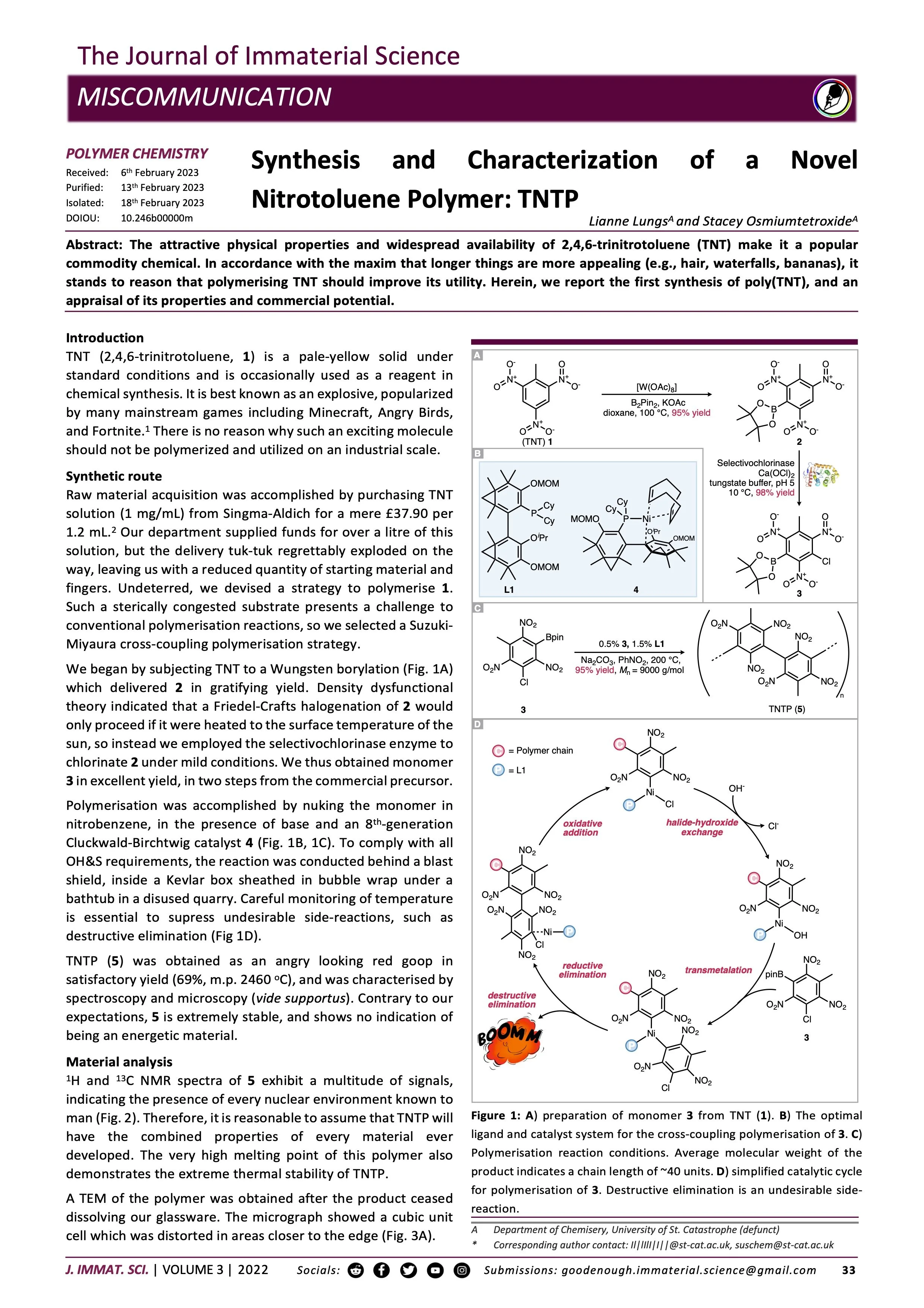 Abstract: The attractive physical properties and widespread availability of 2,4,6-trinitrotoluene (TNT) make it a popular commodity chemical. In accordance with the maxim that longer things are more appealing, it stands to reason that polymerising TNT should improve its utility. Herein, we report the first synthesis of poly(TNT), and an appraisal of its properties and commercial potential.