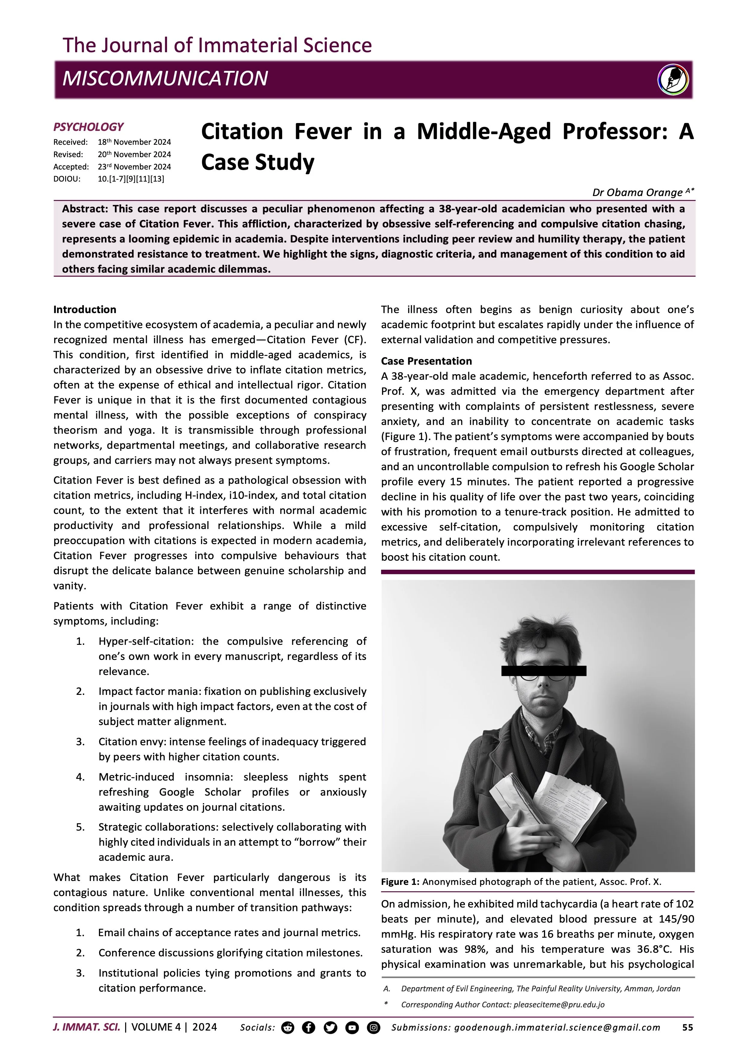 Abstract: This case report discusses a peculiar phenomenon affecting a 38-year-old academician who presented with a severe case of Citation Fever. This affliction, characterized by obsessive self-referencing and compulsive citation chasing, represents a looming epidemic in academia.