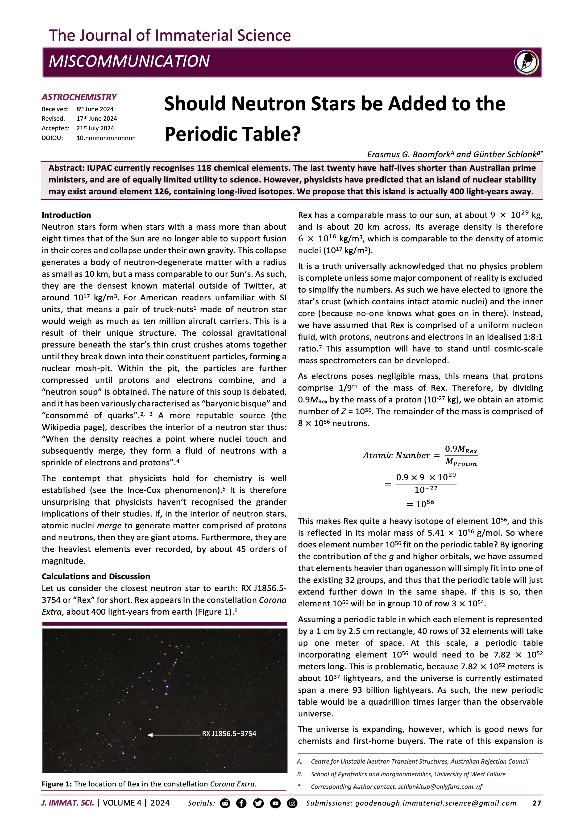 Abstract: IUPAC currently recognises 118 chemical elements. The last twenty have half-lives shorter than Australian prime ministers, and are of equally limited utility to science. However, physicists have predicted that an island of nuclear stability may exist around element 126, containing long-lived isotopes. We propose that this island does exist, about 400 light-years away.