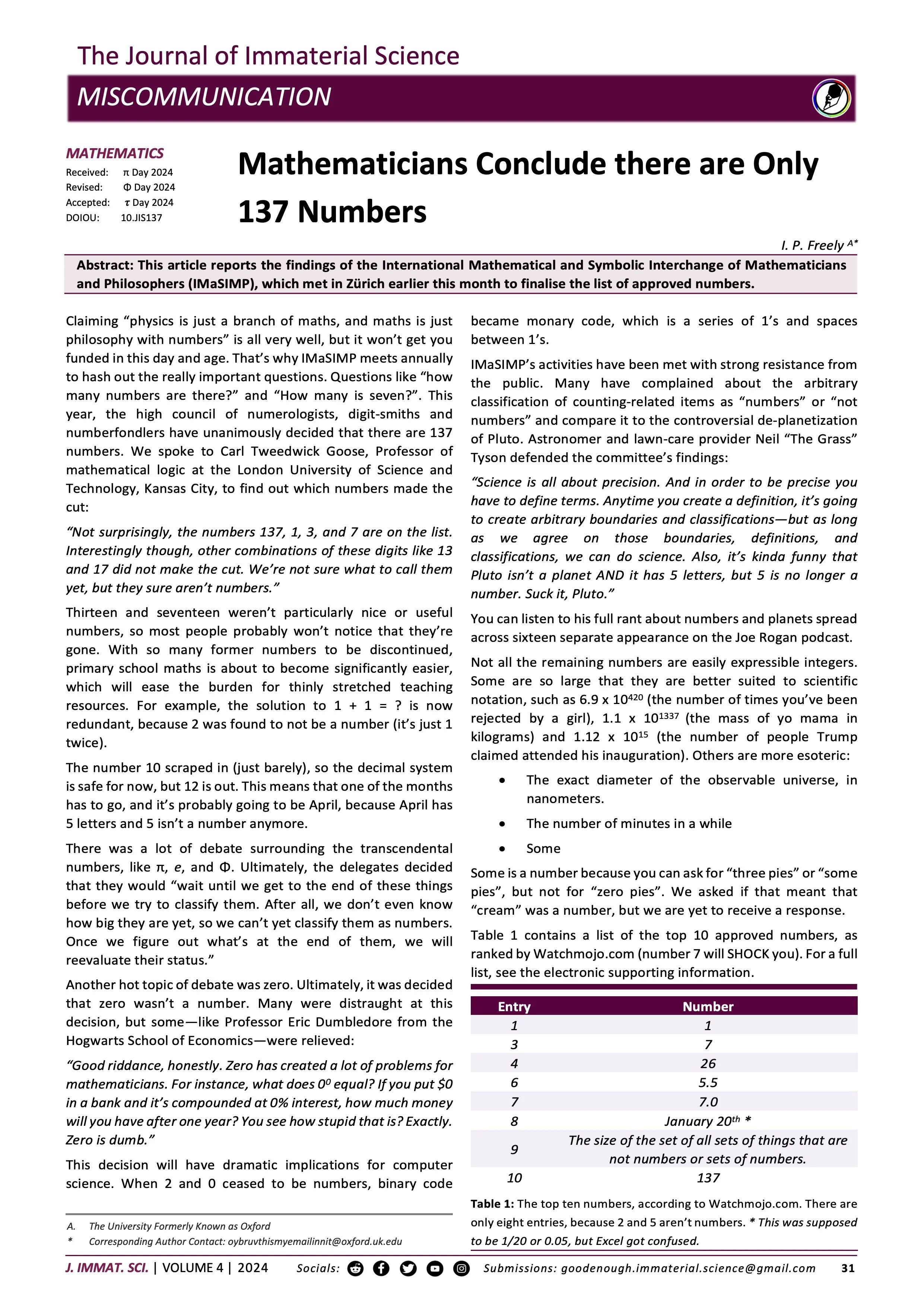 Abstract: This article reports the findings of the International Mathematical and Symbolic Interchange of Mathematicians and Philosophers (IMaSIMP), which met in Zürich earlier this month to finalise the list of approved numbers.