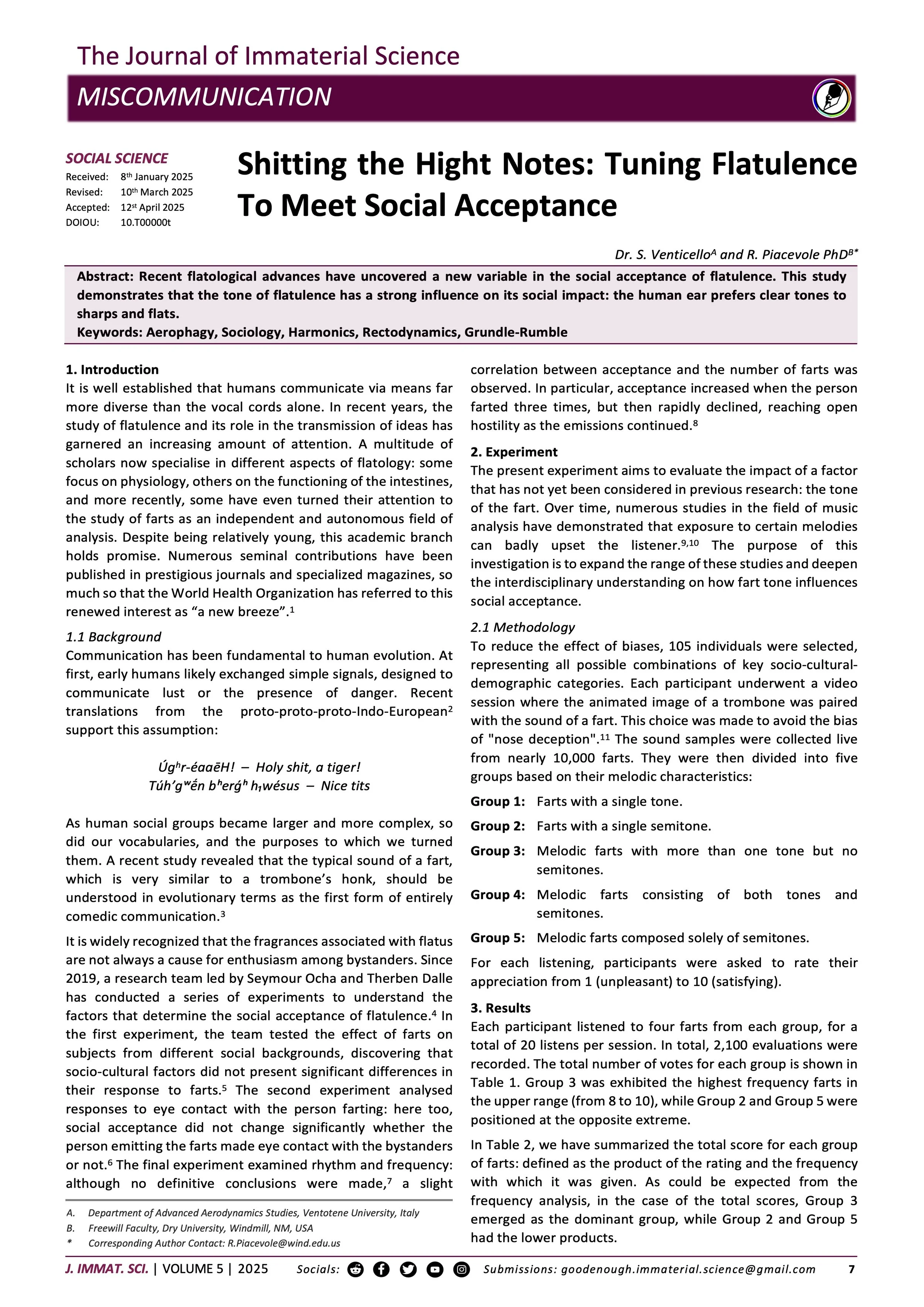 Abstract: Recent flatological advances have uncovered a new variable in the social acceptance of flatulence. This study demonstrates that the tone of flatulence has a strong influence on its social impact: the human ear prefers clear tones to sharps and flats.