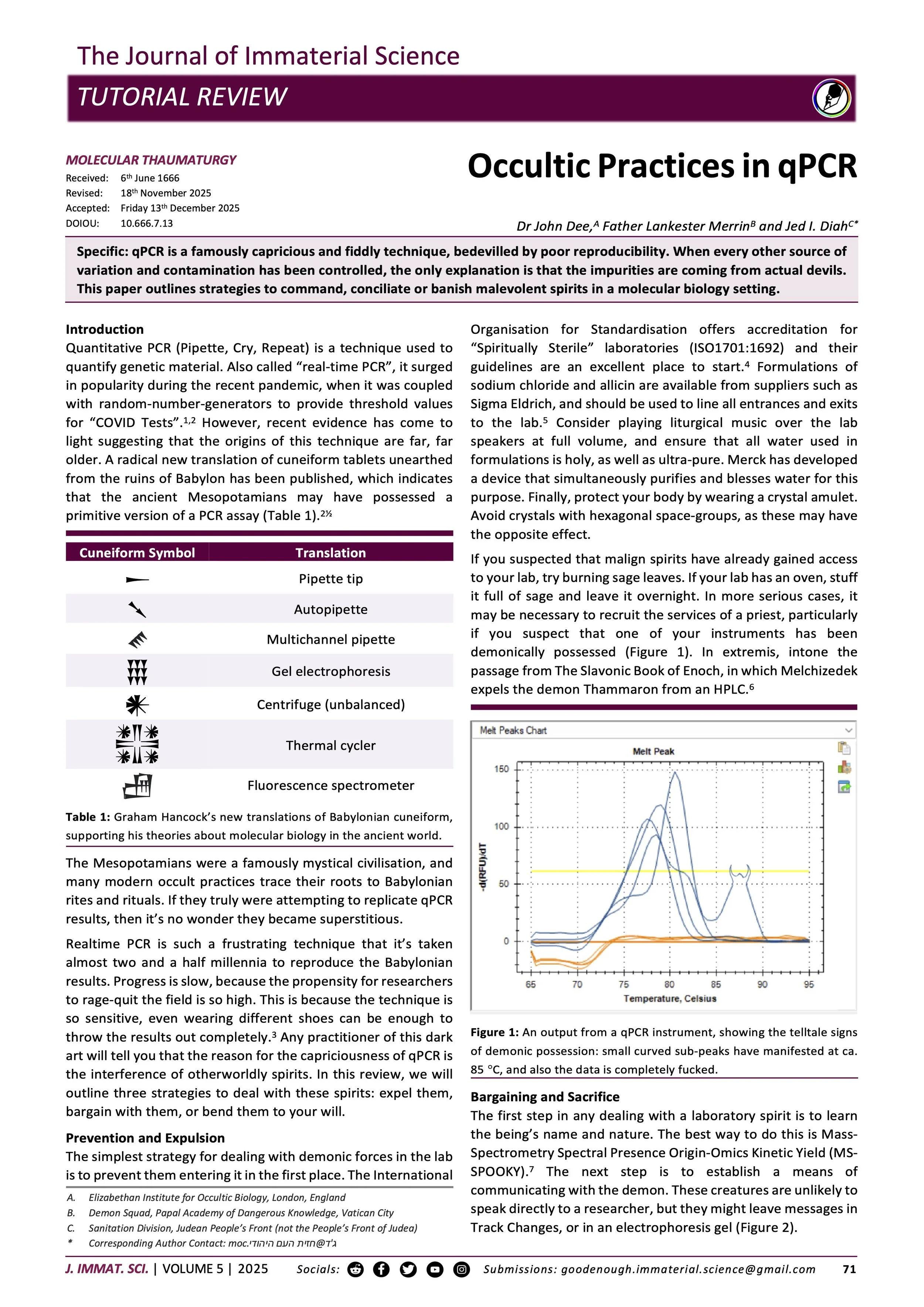 Abstract: qPCR is a famously capricious and fiddly technique, bedevilled by poor reproducibility. When every other source of variation and contamination has been controlled, the only explanation is that the impurities are coming from actual devils. This paper outlines strategies to command, conciliate or banish malevolent spirits in a molecular biology setting.