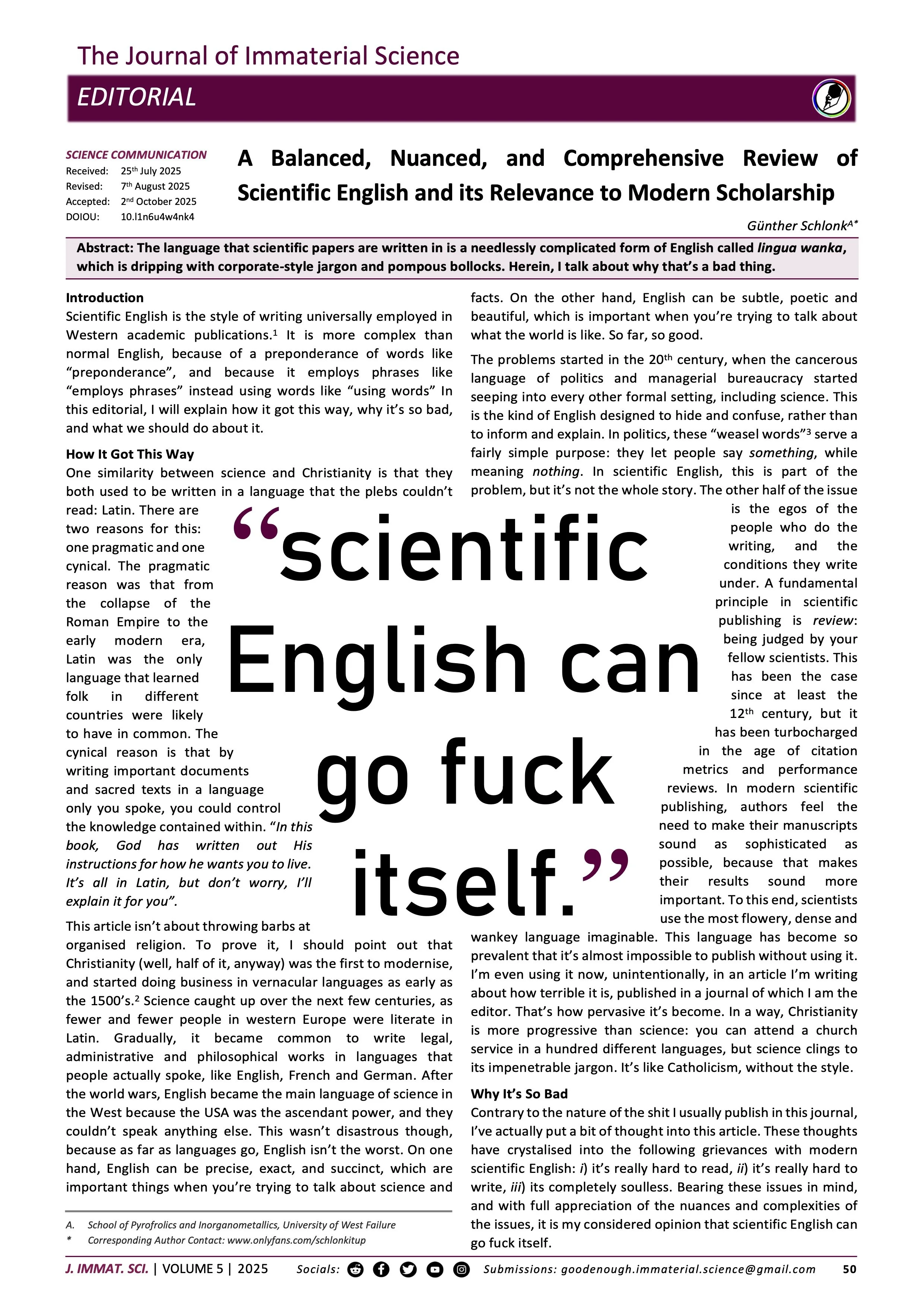 Abstract: The language that scientific papers are written in is a needlessly complicated form of English called lingua wanka, which is dripping with corporate-style jargon and pompous bollocks. Herein, I talk about why that’s a bad thing.