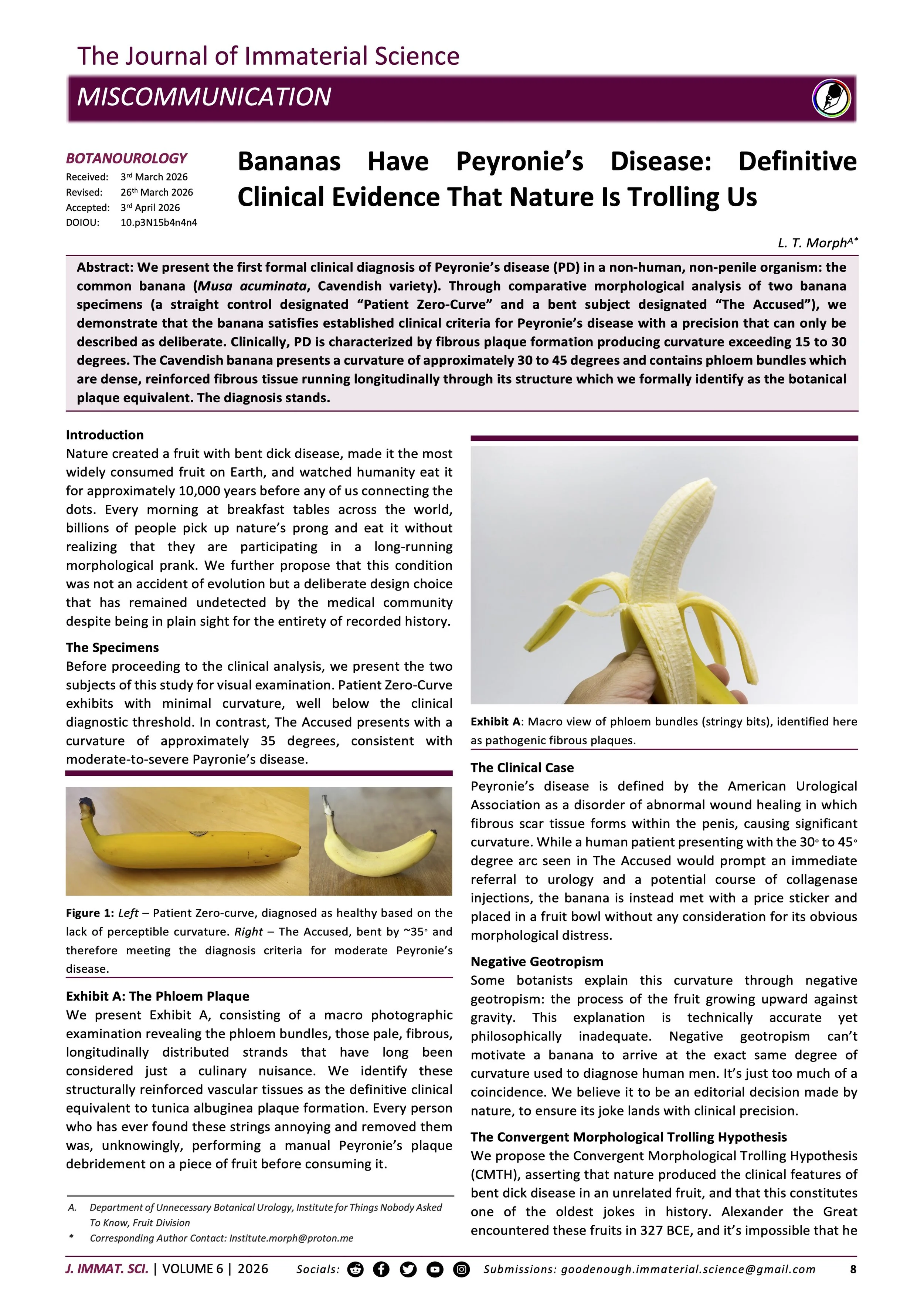 Abstract: We present the first formal clinical diagnosis of Peyronie’s disease (PD) in a non-human, non-penile organism: the common banana (Musa acuminata, Cavendish variety).