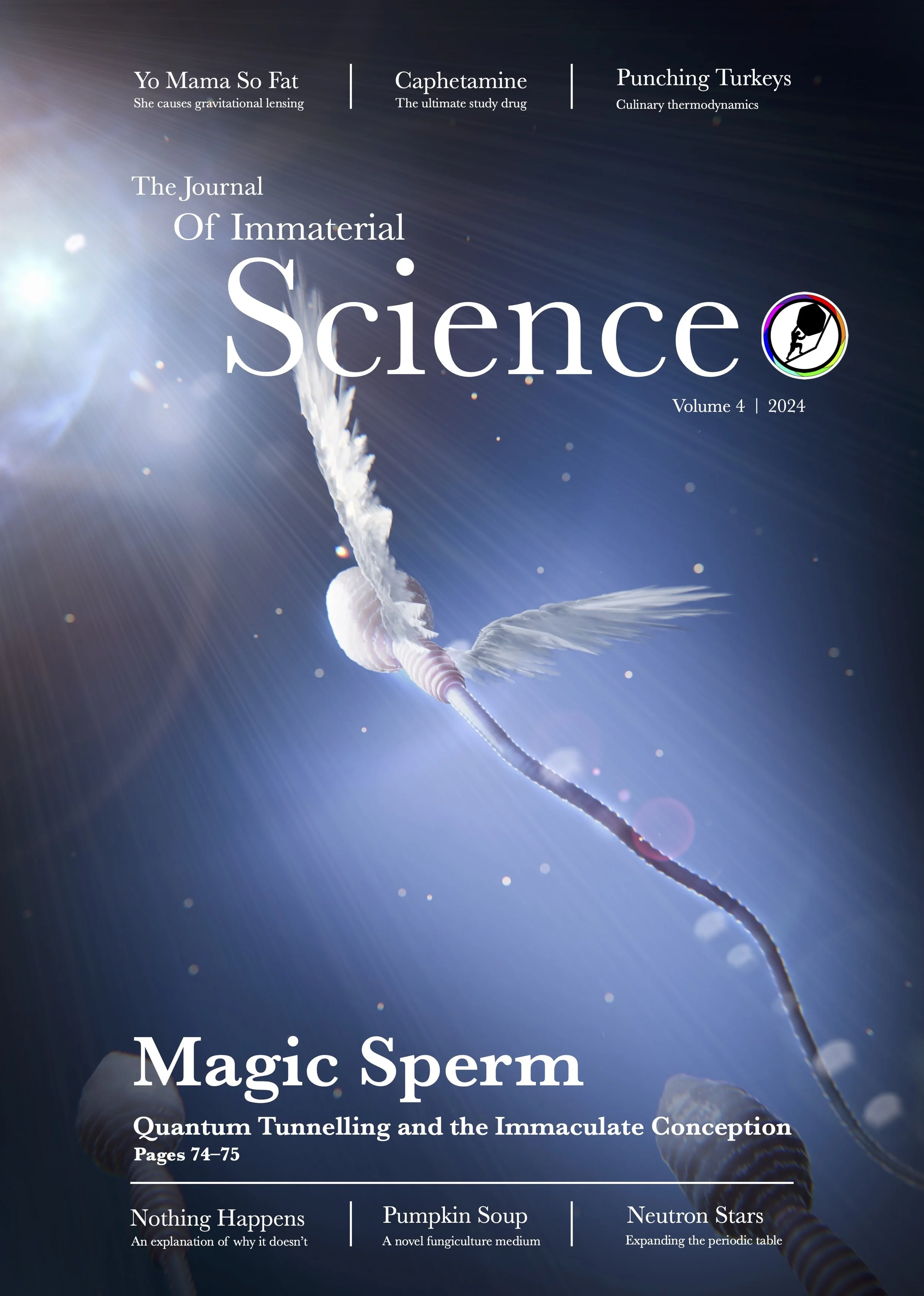 The articles in Volume 4 of J. Immat. Sci. report the strongest bond in chemistry, calculate your mother’s mass, define neutron stars as atoms, build a molecule that can run DOOM, prove the existence of God, and categorise VTuber fanbases as cults.